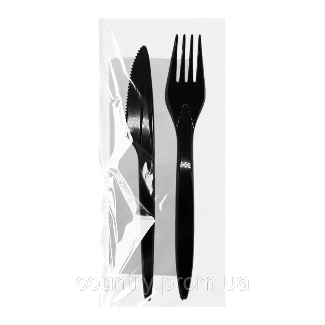 Преміум набір чорний одноразових столових приборів (виделка+ ніж + серветка) упаковка 200шт